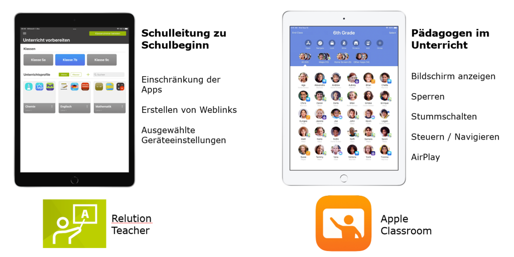 Mit der Hilfe von der Teacher- und der Classroom App verwalten wir die IPads im Schulalltag.